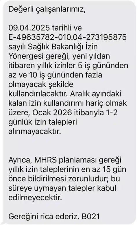 hastane yönetimi tarafından personele iletilen mesajda, uygulamanın dayanağı olarak 09.04.2025 tarihli Sağlık Bakanlığı İzin Yönergesi gösterildi. Gönderilen talimatta, yeni yıldan itibaren yıllık izinlerin 5 iş gününden az ve 10 iş gününden fazla olmayacak şekilde kullandırılacağı kesin bir dille belirtildi.