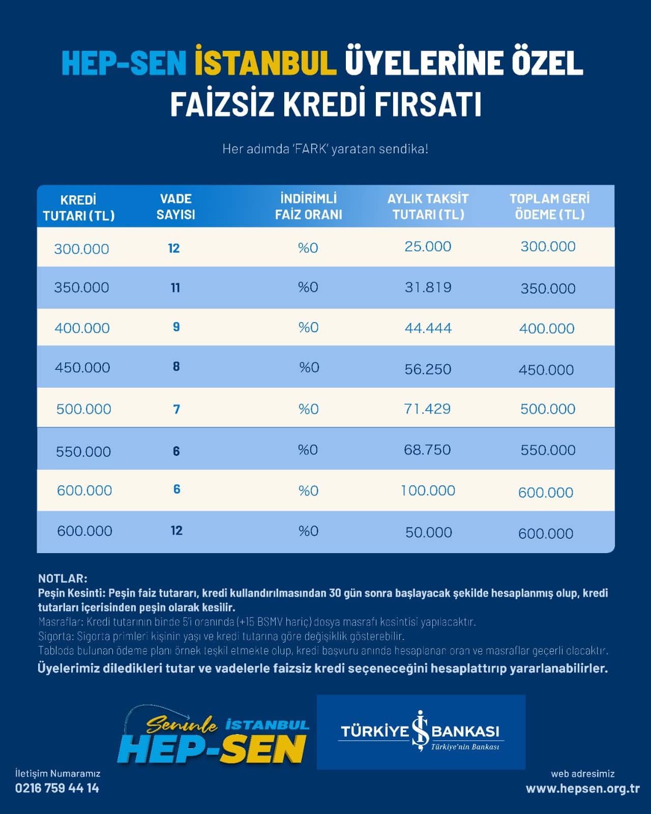 Hep-Sen İstanbul Şubesi, üyelerinin ekonomik koşullarına destek olmak amacıyla İş Bankası ile kritik bir protokole imza attı. Yapılan anlaşma kapsamında sendika üyelerine, özellikle maaş promosyonu iptalleri ve geri ödemelerinde kullanılmak üzere 600.000 TL’ye varan limitlerde faizsiz kredi imkanı sunuluyor.