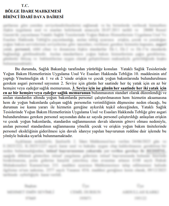 Mahkemenin gerekçeli kararında, Sağlık Bakanlığı tebliğine atıfta bulunularak yoğun bakım ünitelerinde bulunması gereken zorunlu asgari personel sayıları net bir şekilde hatırlatıldı: